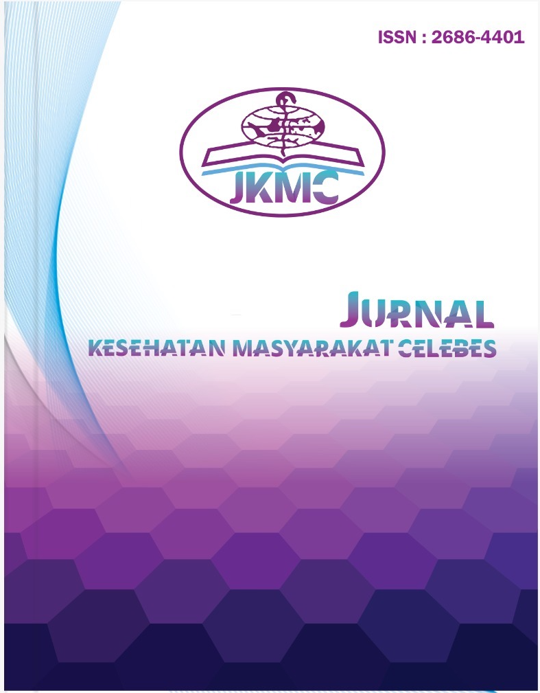 Vol 6 No 03 (2025)Jurnal Kesehatan Masyarakat Celebes (JKMC) adalah jurnal ilmiah yang diuraikan berdasarkan pendekatan kesehatan. Jurnal ini memuat hasil hasil penelitian, review artikel, letter to the editor, ataupun tulisan lainnya yang terkait dengan kesehatan. Khususnya yang terkait dengan: Epidemiologi, Biostatistik, Kesehatan lingkungan, Kesehatan dan keselamatan kerja, Gizi masyarakat, Kesehatan reproduksi, Kebijakan dan manajemen kesehatan dan Promosi kesehatan.